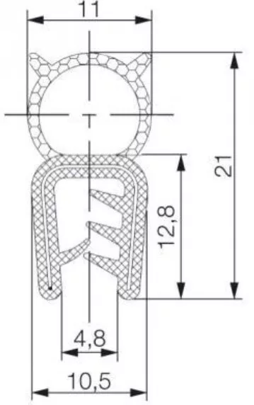 EPDM kombinált profil fémbetéttel/Fekete/Befogási tartomány = 2-5 mm / Fekete / 70 ± 5 ShA / 0,55 g/cm3